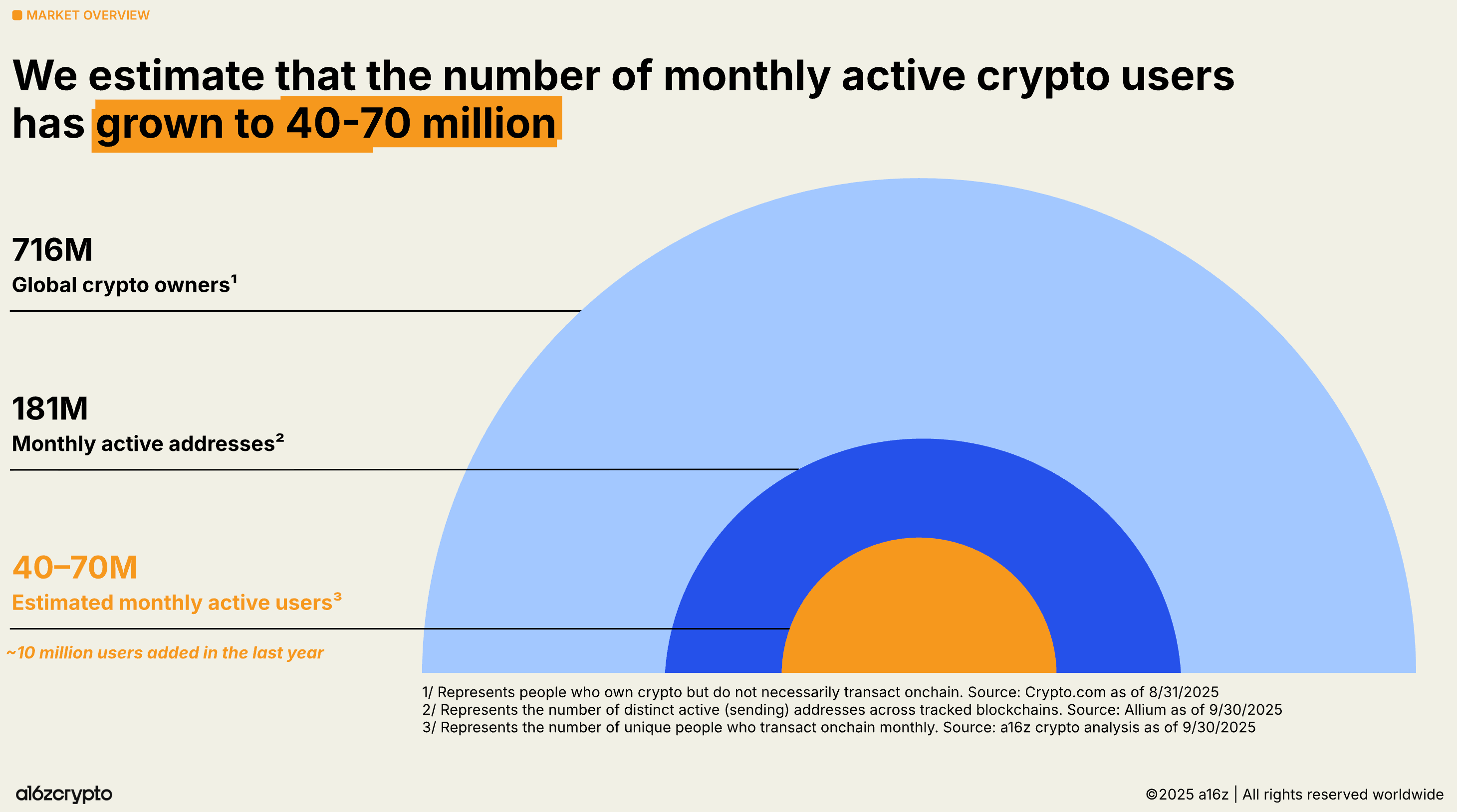 Crypto can still be seen as a very early-stage technology. Bitcoin was launched in 2008, and since then, it has gone through multiple cycles, massive hype, deep crashes, and broad public exposure. Yet, if you look at real usage today—and if you remove bots, on-chain noise, and AI-generated activity, whether on blockchains or social networks—you probably end up with something like 40 to 70 million active monthly users.