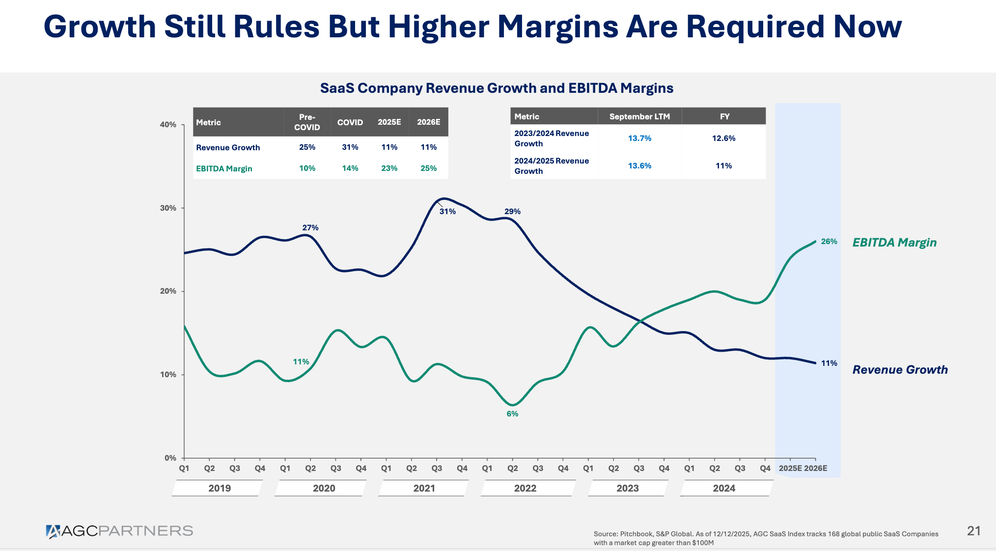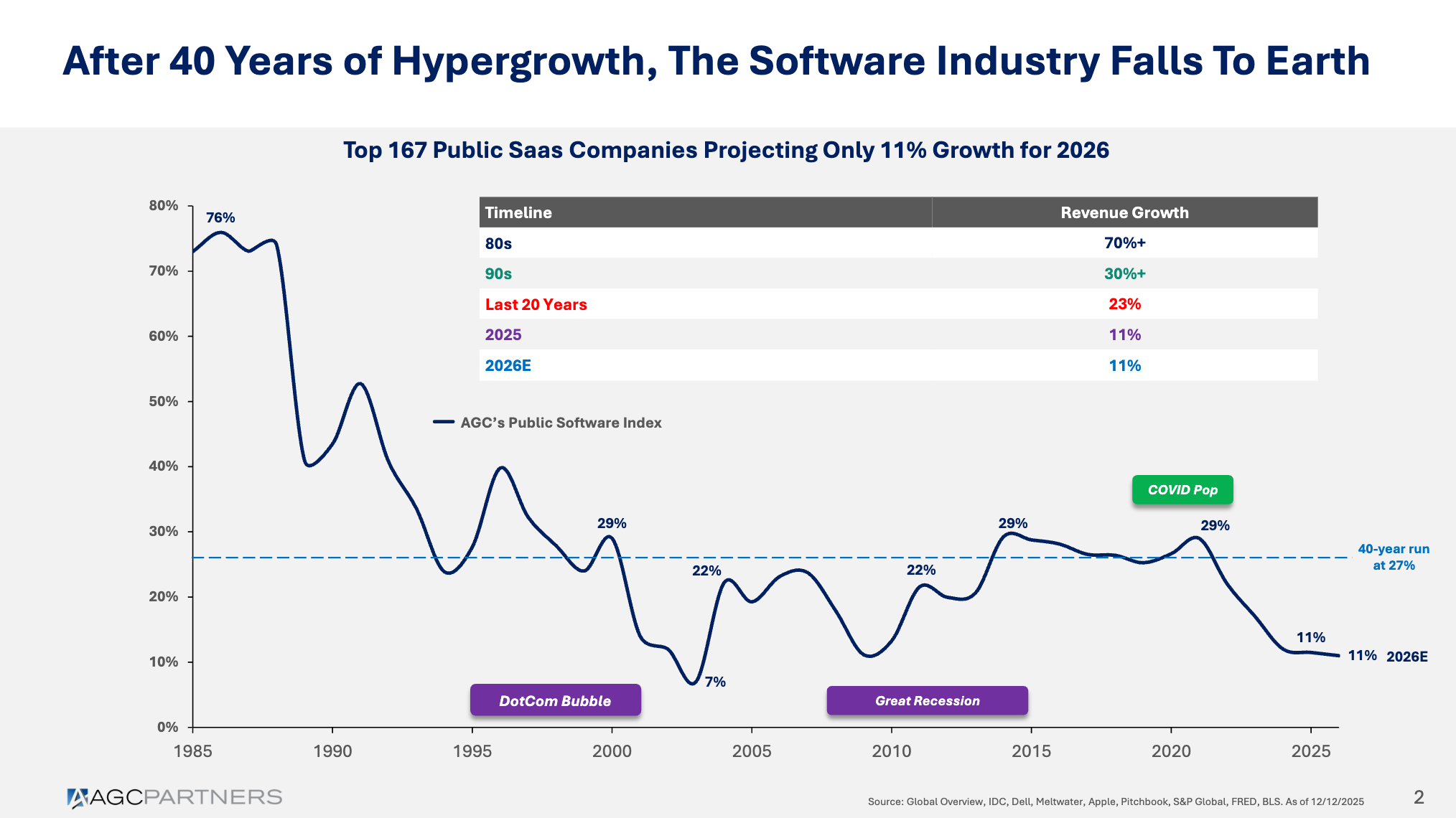 According to AGC Partners’ Q4 2025 Tech Capital Markets report, the top 167 public SaaS companies are projecting just 11% revenue growth for 2026. Not 70%. Not 30%. Not even 23%.