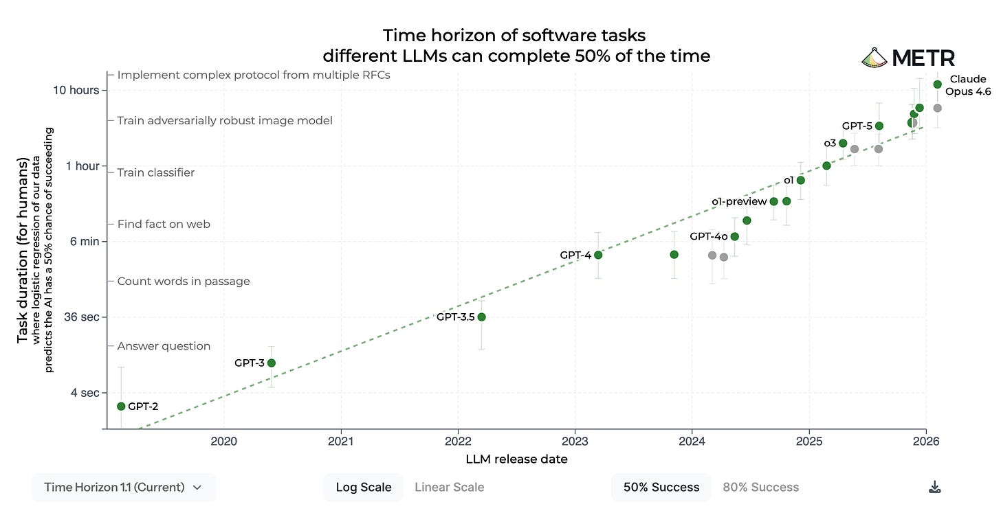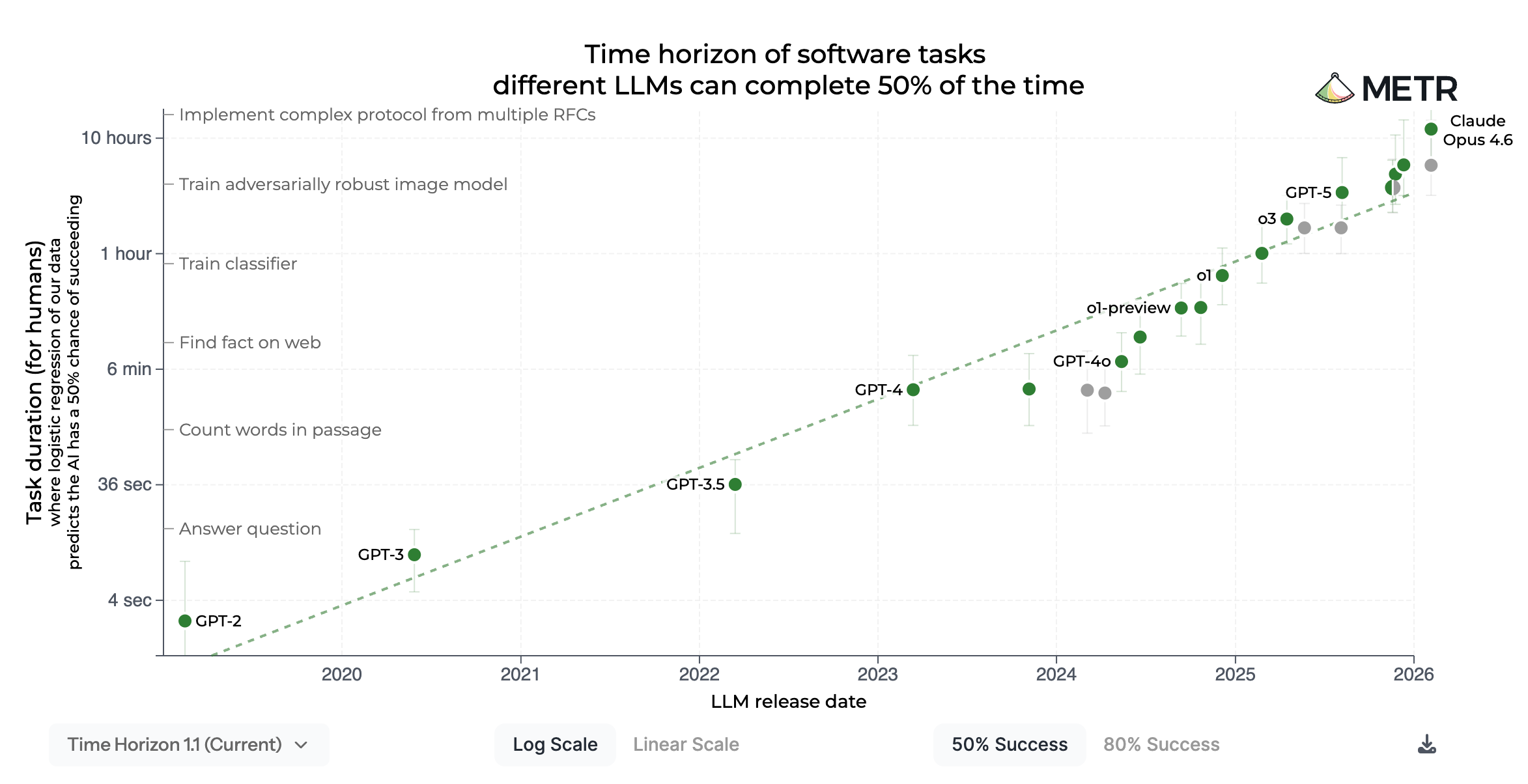 Early 2026: ~10 hours (Claude Opus 4.6)